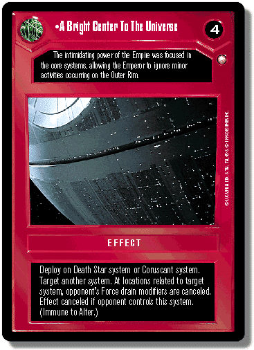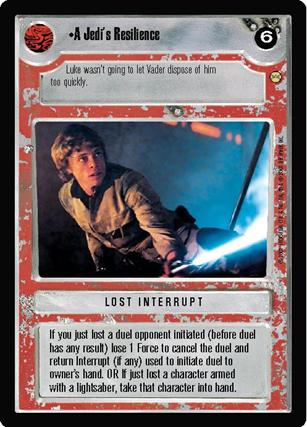 Si vous venez juste de perdre un duel initié par votre adversaire ( avant que ce duel ait eu un quelconque résultat ), perdez 1 point de Force pour annuler le duel et retournez la carte d'interruption ( s'il y en avait une ) utilisée pour initier le duel vers la main de son propriétaire . OU si vous venez juste de perdre un personnage armé d'un sabre laser, prenez ce personnage dans votre main .