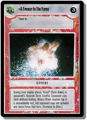 Une fois par partie, durant votre phase de déploiement, " insérez " ( à l'envers ) dans la pile de réserve de votre adversaire; remélangez . Quand l'effet arrive en haut, il est immédiatement perdu, mais l'adversaire ne peut plus activer de Force supplémentaire ce tour . ( Immunisé à la carte Alter : altération ) .